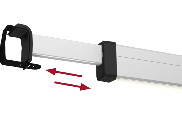 Neue Spannstange für die Markise F40van, für ein optimal gespanntes Tuch. Durch die Montage senkrecht zu den Markisenarmen bietet die Spannstange einen höheren Windwiderstand und verhindert die Bildung von Wassersäcken bei Regen. Außerdem ist diese mit LEDs ausgestattet, um den Urlaubsraum zu beleuchten.