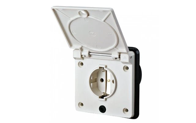 Außensteckdose für 230 V-Stromabnahme. Mit Klappdeckel. Wasserdicht durch Gummidichtung. Schutzart: IP44 (Geschützt gegen feste Fremdkörper mit Ø ≥ 1,0 mm, Schutz gegen allseitiges Spritzwasser)