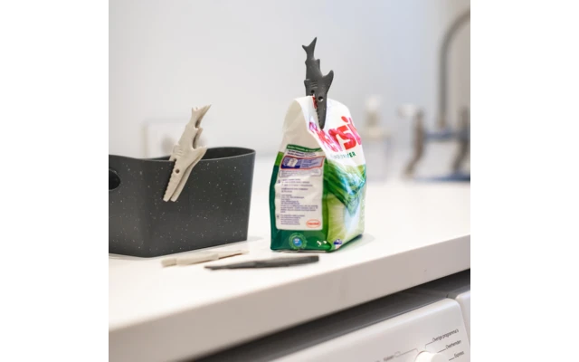 SHARKY greift die Form der traditionellen Sturmwäscheklammer auf und kommt gänzlich ohne Metallfeder aus. So kann auch nichts rosten und die Wäsche wird nicht verschmutzt. Die originelle Wäscheklammer ist nahezu unverwüstlich und hält auch nordischen Windstärken noch sicher stand. Auch wunderbar als Verschluss für Beutel und Tüten geeignet. SHARKY besteht zu 100% aus recyceltem Kunststoff sowie Zellulose und spart damit mehr als zwei Drittel CO2 im Vergleich zu neuen Materialien ein.